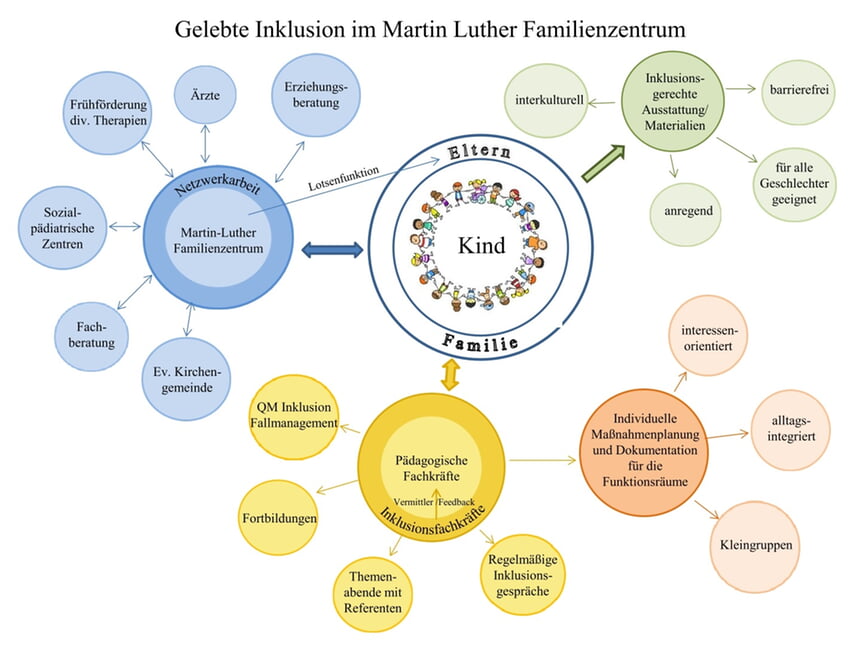 Inklusion bedeutet, dass jeder Mensch die Möglichkeit erhält, sich vollständig und gleichberechtigt an allen gesellschaftlichen Prozessen zu beteiligen – und zwar von Anfang an und unabhängig von seinen individuellen Fähigkeiten, seiner ethischen wie sozialen Herkunft, seinem Geschlecht oder Alter.Unter Inklusion verstehen wir im Martin-Luther Familienzentrum die Förderung des Zusammenlebens von Kindern aus unterschiedlichen Lebenssituationen. Es handelt sich um eine Pädagogik der Vielfalt und Achtsamkeit, die sich an den Bedarfslagen aller Kinder orientiert.