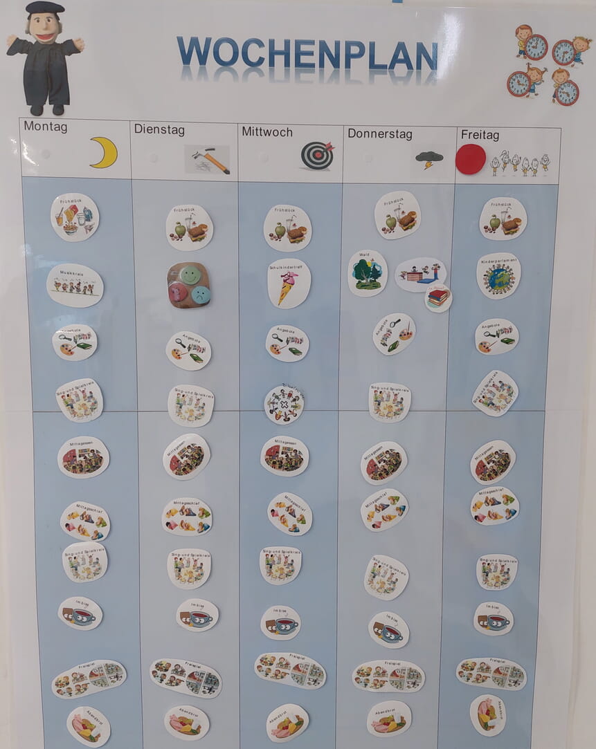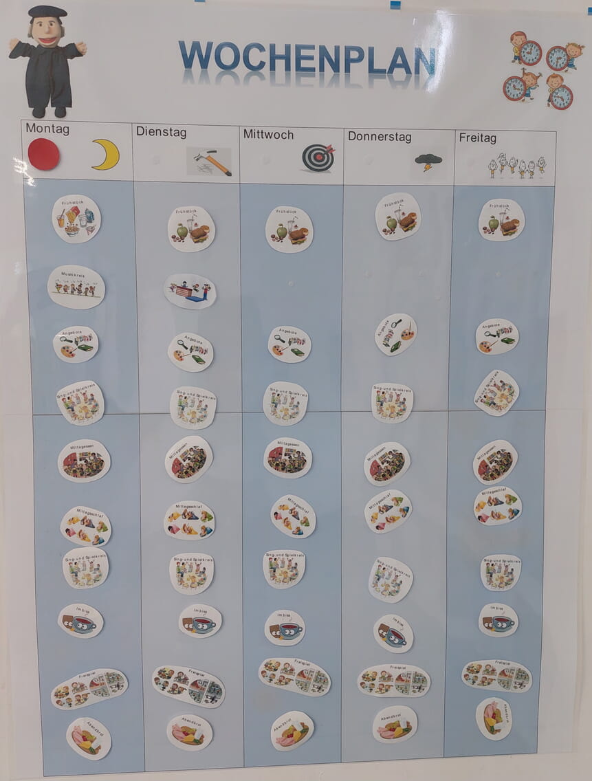 Feste Aktionen, wie z.B. unser Schulkindtreff, Kinderparlament oder unseren Waldtag entnehmen Sie aus dem Bild des Wochenplans.